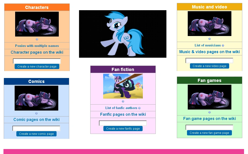 Should be fairly self-explanatory. The images are placeholders, obviously; they would function in much the same way as the Featured Articles on the FiM Wiki, rotated in and out on a regular basis. The wikia pony is intended to lead here, like it does now; that page needs to be reworked a little to make it more of a "helpful links" hub (I've already started work on the Templates hub page). The sliver of pink at the bottom is a collapsible (and - by default - collapsed) table with all the "other stuff", organised a bit more logically than it is now. --Tulipclaymore 17:23, March 8, 2012 (UTC)