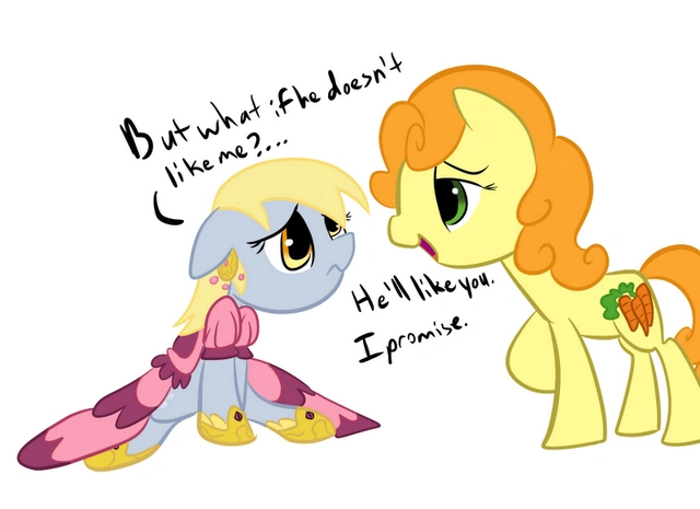 Carrot has to give Ditzy a serious pep talk to get her to go, but the pegasus ends up arriving too late to catch the farmer. After another talk with Carrot Top, Ditzy works up the nerve to visit Mac at Sweet Apple Acres and present him with a written declaration of her feelings for him. After reading it, Big Macintosh asks Ditzy out for dinner. The date begins awkwardly, but as the evening goes on the pair find they enjoy one another's company.