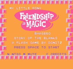 Story of the Blanks, also titled in-game as My Little Pony Friendship is Magic: Story of the Blanks and Friendship is 8-bit: Story of the Blanks, is a fan-made video game first made available on Newgrounds.com. The player takes on the role of Apple Bloom as she discovers a hidden town in the Everfree Forest, where the game delves into the horror genre. The game was created by Donitz, and it is constrained to use genuine NES graphics and graphical limitations.